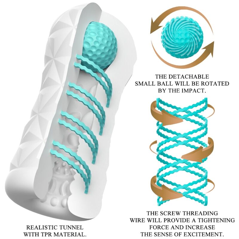 Little tool for gigantic masturbation fun! This transparent and reusable masturbator has a rotating spiral and a stimulation ball on the side, the rotating spiral makes the masturbator rotate during penetration and the ball on the top can stimulate the right spot and give you a new sensation. The sheath has a stimulating and exciting texture inside that massages the penis intensely and dynamically during manual work. You can use this stylish skin-friendly masturbator over and over again. Very easy to use and pure pleasure!